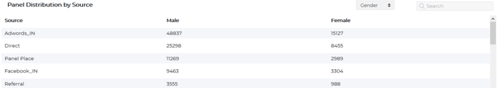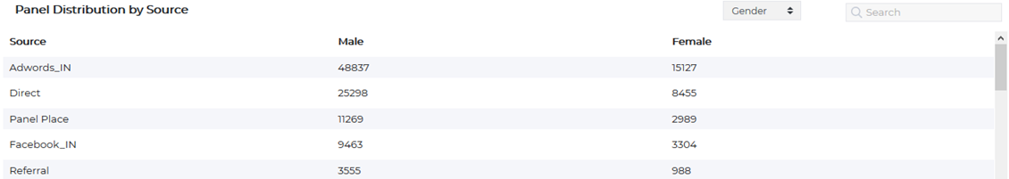- Distribution by Source: Traffic source/Affiliate specific panel distribution on Gender, Age group and Region.