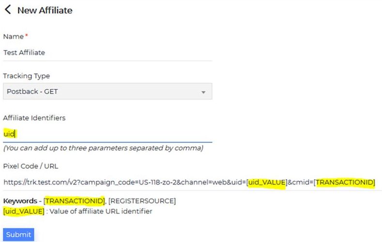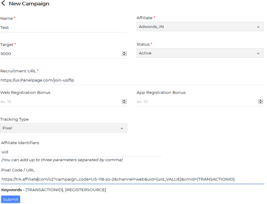 - Affiliate Identifiers: Add Identifiers if any to be passed back to the affiliates through the pixel codes. These identifiers will be passed in the recruitment page URL at affiliates end and they would expect us to pass it back through the tracking codes.