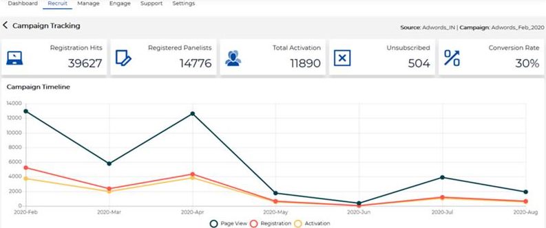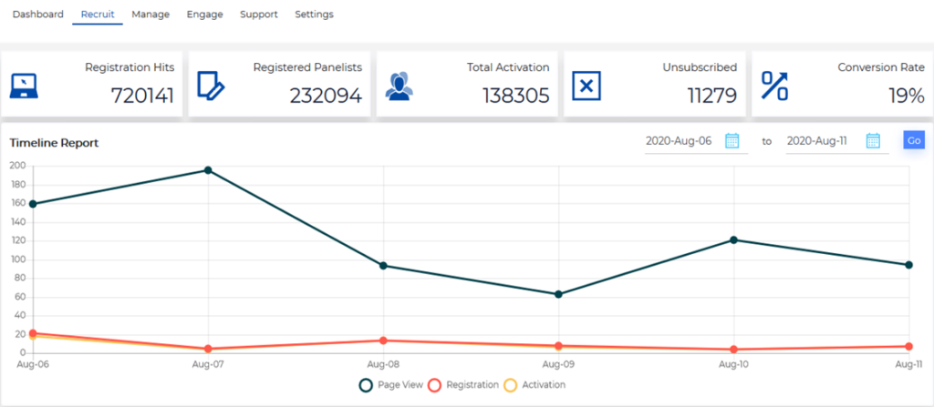 - Panel Stats: Snapshot on overall panel performance. Track active members, panel response rate, Profiling depth, panel retention rate and unsubscribe rate on a glance.