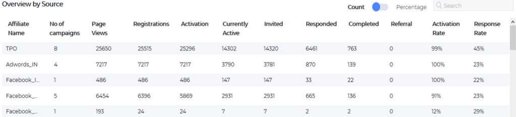- Overview by Source: Traffic source/Affiliate specific conversions, utilization, retention and responsiveness metrics.