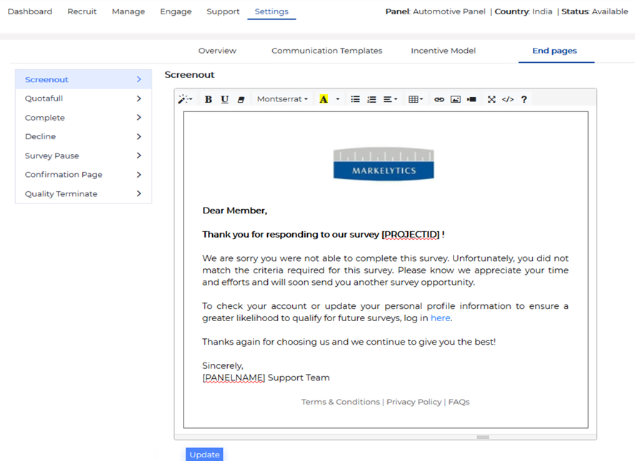 End Pages: Standard End pages. Members will be routed to these pages based on their statuses upon completing a study. HTML driven pages that can be customised as per the brand requirements.